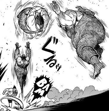Kono Haruo is extremely physically powerful, boasting incredible physical strength, durability and endurance. His strength is great enough that with just a full-body tackle, he was capable of sending Akoya Seishu hurtling destructively into the arena wall.[9] Even as a teenager, Haruo was already capable of climbing a cliff carrying a live weight of around 480kg with ease.[2] Haruo was also resilient enough to take many of Akoya's attacks before being taken down. Even as he was passing out, he managed to stop the referee and keep fighting using his sheer will.[10] However, despite his great physical endurance, his knees are rather vulnerable due to having to constantly carry his large bulk.[11] Haruo's most impressive physical capabilities are his unprecedented agility and physical speed; considering his incredible size and weight, Haruo moves his 315kg frame with shockingly deft lightness.[9] An example was when he evaded Akoya's kick with a backflip and then tackled him before the latter even had a chance to dodge.[9]